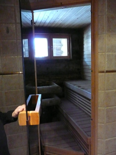 The sauna room that's inside a huge shower room